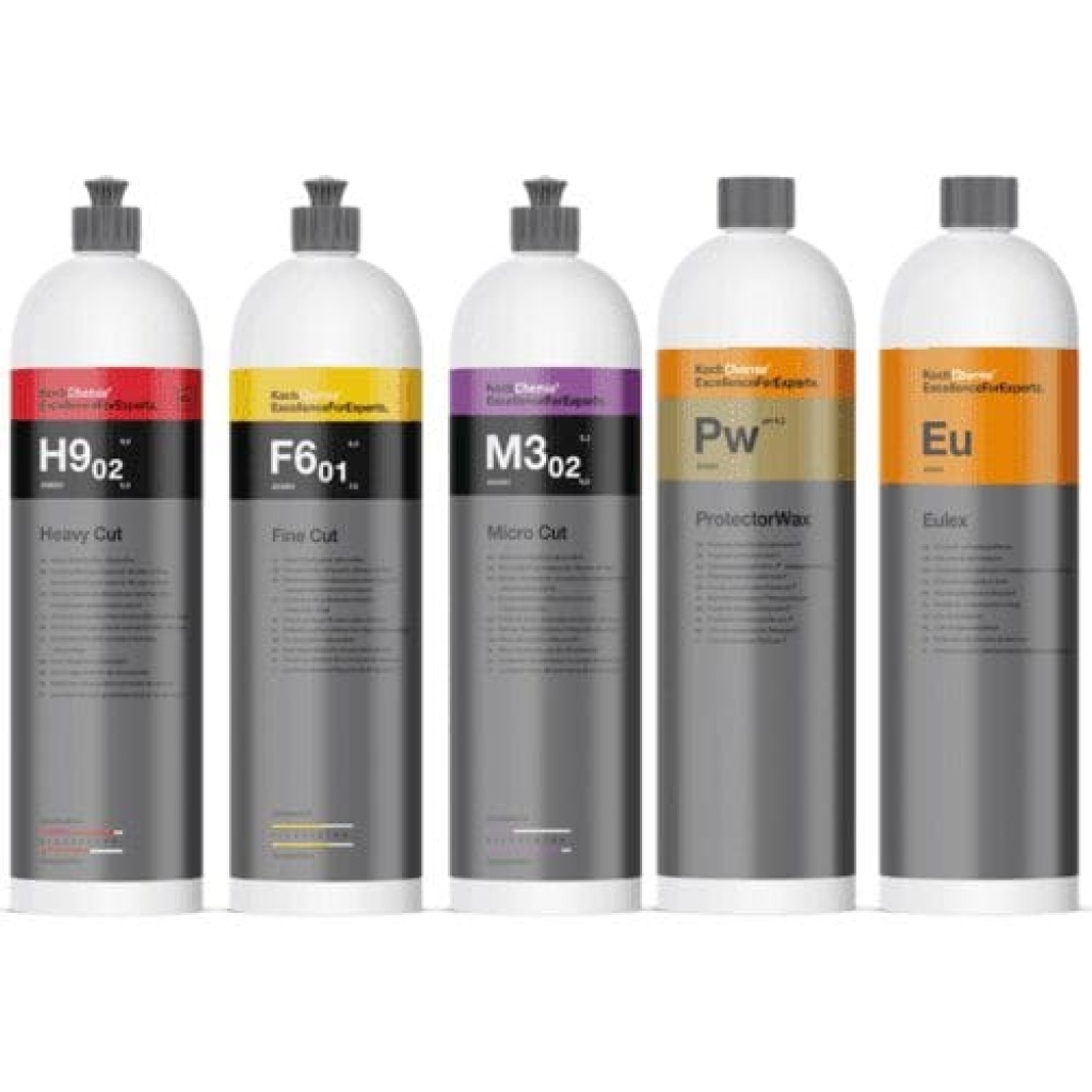 Koch Chemie H9.02 + F6.01 + M3.02 + PW + EU 1Lt. Pasta Seti, otomobil tutkunları ve profesyonel detaycılar için mükemmel bir çözüm sunar. Bu set, farklı ihtiyaçlara yönelik tasarlanmış dört ana ürün içerir. H9.02 Ağır Çizik Giderici Pasta, derin çizikleri kolayca yok ederken, F6.01 Hafif Çizik Giderici Pasta, orta düzeyde hasarları hızlı bir şekilde düzeltir. M3.02 Micro Cut Cila ise yüksek parlaklık sağlar ve ışık oyunlarından arındırılmış, pürüzsüz bir yüzey sunar.