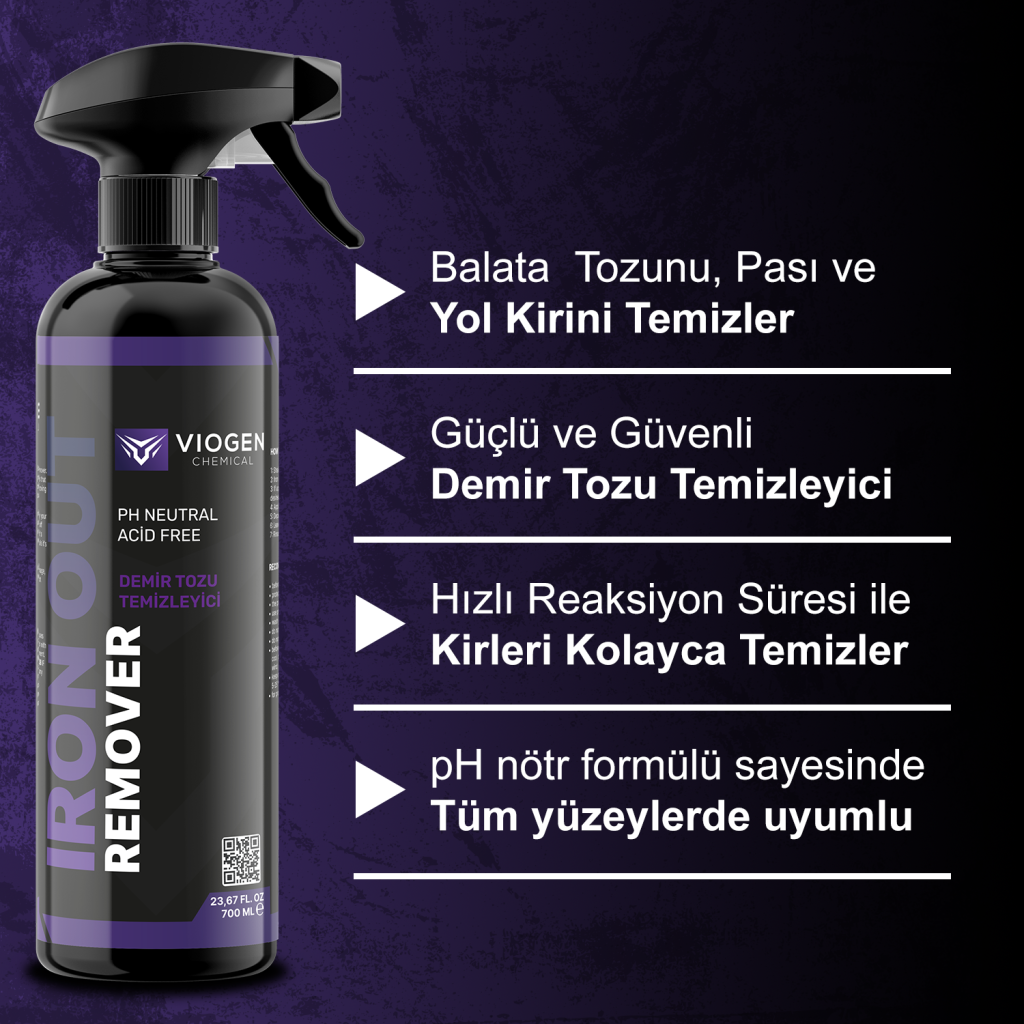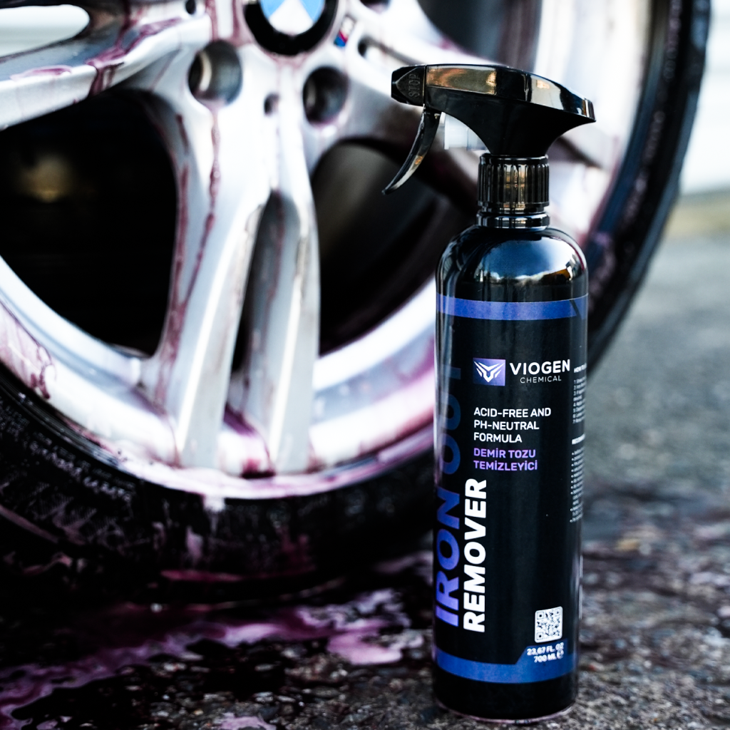 Viogen Chemical Iron Out Remover 700ML; araç bakım uzmanları ve oto yıkama merkezleri için formüle edilmiş yüksek etkili bir demir tozu çözücüdür. Metalik parçacıklar (fren tozu, ray pası, endüstriyel partiküller) ile reaksiyona girerek görünür kirleri ve paslı lekeleri yumuşatır, kolayca durulanıp giderilmesini sağlar.